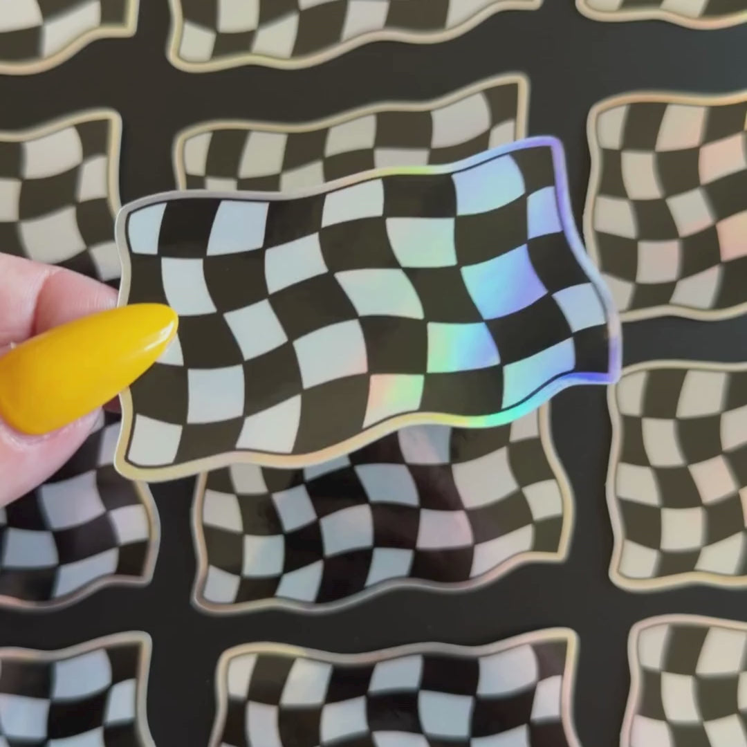 Wave the finish line wherever you go with this Checkered Flag Holographic Sticker! Featuring a bold illustration of a waving checkered flag, this design shines with a holographic finish that shifts and sparkles with every angle—just like the thrill of race day.