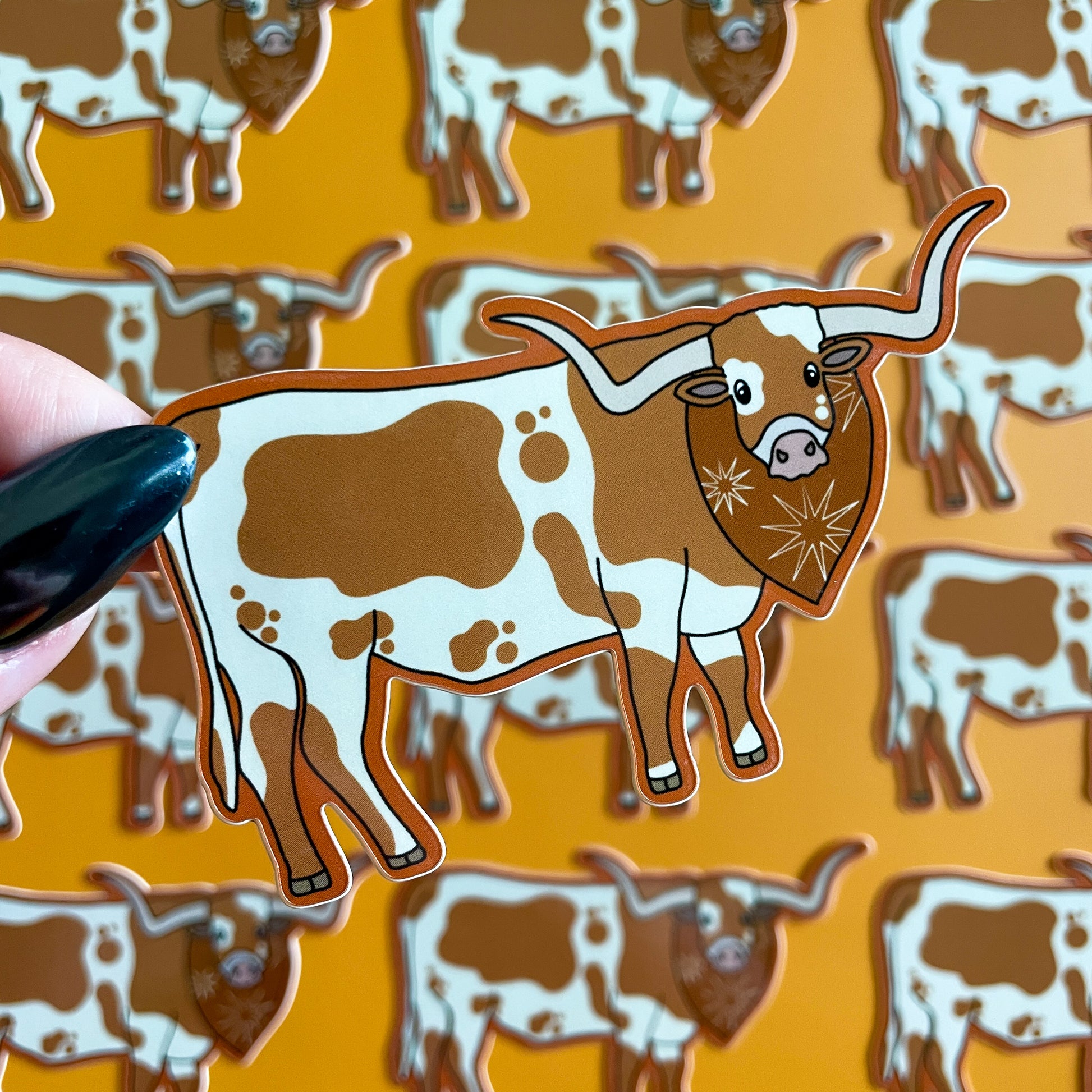 Bring a touch of Texas flair to your collection with this Longhorn Sticker! Featuring a hand-drawn illustration of a white longhorn with brown spots, wearing an orange bandana, this design is perfect for showing off your Lone Star State pride, western style, or love for these iconic cattle.